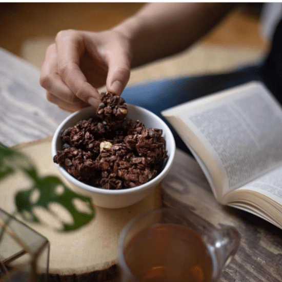 Prends 20 g de granola avec un carré de chocolat noir 85 %, accompagné d’une tisane ou d’une eau citronnée. Parfait pour combler un petit creux sans excès.
